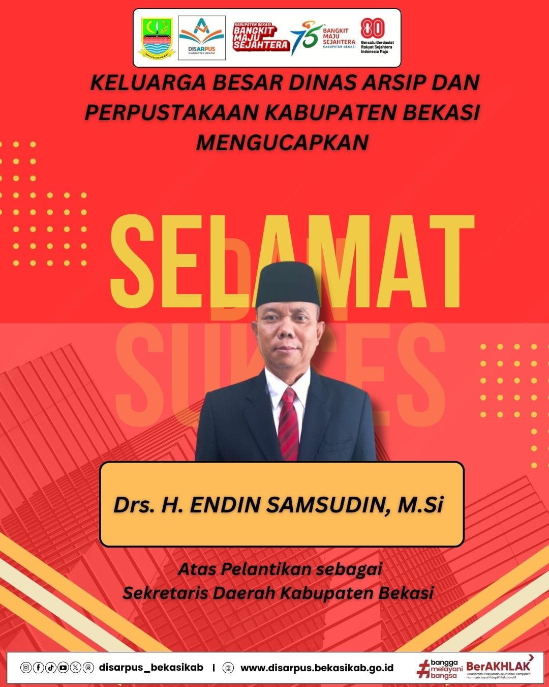 Keluarga Besar Dinas Arsip dan Perpustakaan Kabupaten Bekasi menyampaikan ucapan selamat dan sukses atas dilantiknya Bapak Drs. H. Endin Samsudin, M.Si. Semoga kepemimpinan yang amanah dan visioner dapat membawa Kabupaten Bekasi menuju tata kelola pemerintahan yang semakin maju, berdaya saing, dan berintegritas.