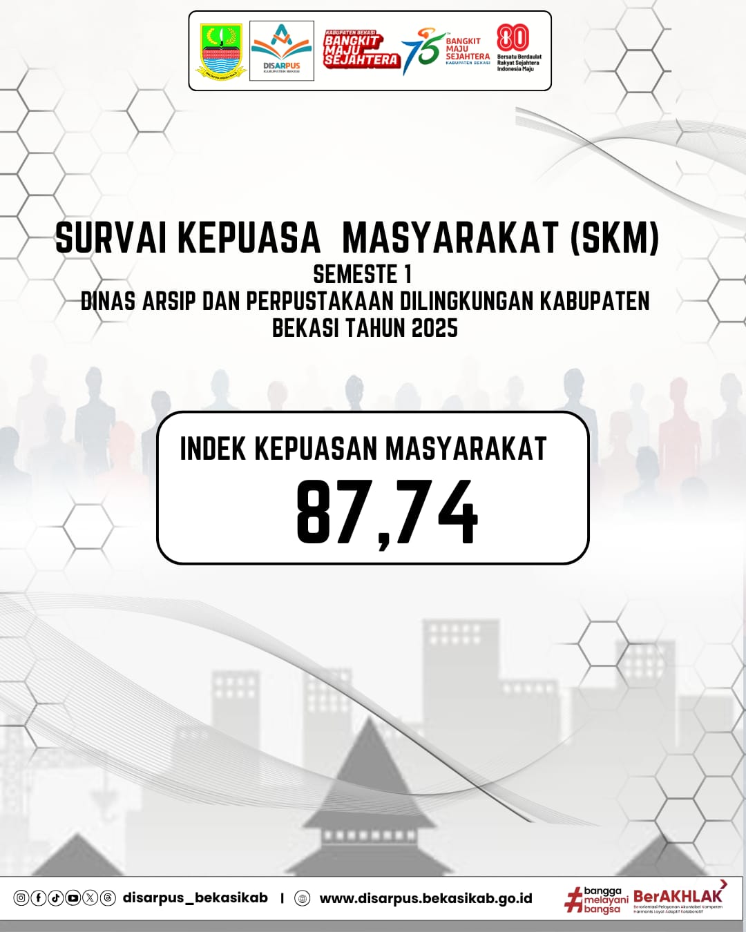 Dinas Arsip dan Perpustakaan (Disarpus) Kabupaten Bekasi kembali menunjukkan komitmennya dalam meningkatkan kualitas pelayanan publik. Berdasarkan hasil Survei Kepuasan Masyarakat (SKM) Semester I Tahun 2025, Disarpus Kabupaten Bekasi berhasil meraih Indeks Kepuasan Masyarakat (IKM) sebesar 87,74. Capaian ini mencerminkan bahwa layanan arsip dan perpustakaan yang diberikan kepada masyarakat berada dalam kategori “Sangat Baik”, serta menunjukkan adanya peningkatan kualitas pelayanan, efektivitas, dan responsivitas aparatur dalam memenuhi kebutuhan masyarakat.
